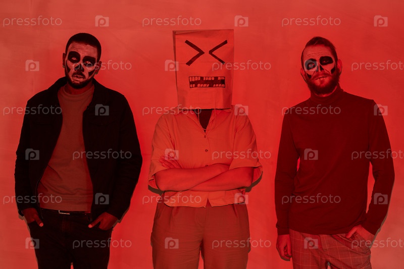 Группа молодых друзей с ужасающим макияжем и человек с недовольным лицом на бумажном мешке стоят в очереди, эффект красного света