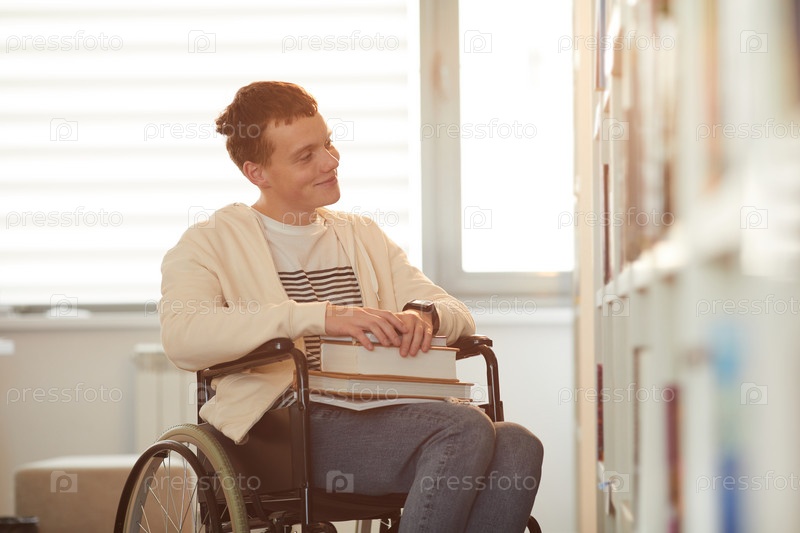 Мальчик в инвалидном кресле, выбирающий книги