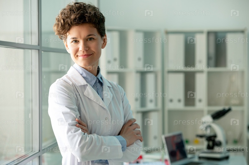 Счастливый молодой успешный исследователь в белом халате стоит перед камерой