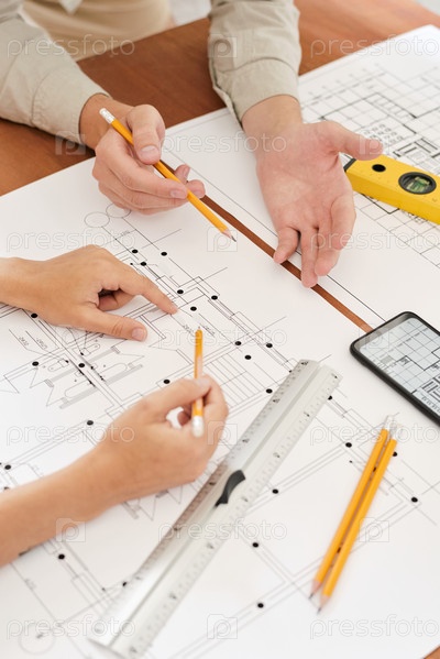 Руки двух молодых современных инженеров, обсуждающих новые эскизы на встрече