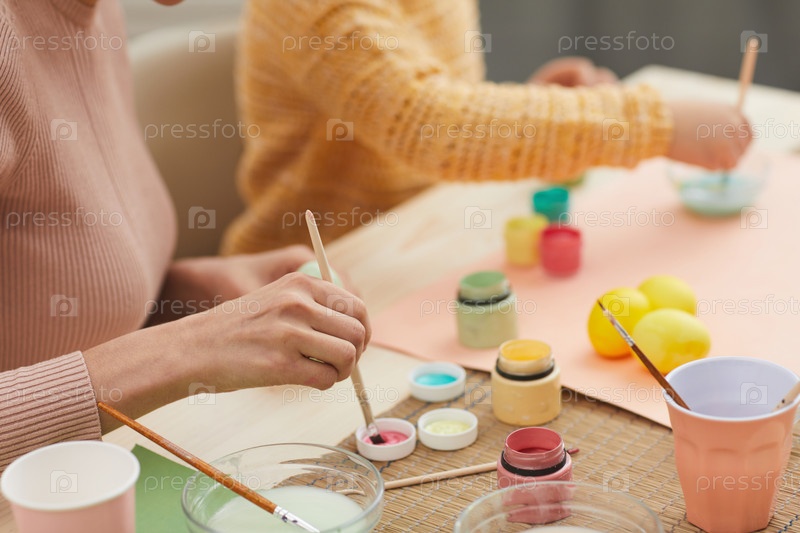 Молодая женщина рукой рисует пасхальные яйца с дочерью