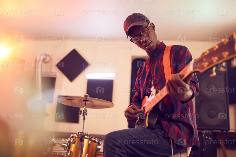 Молодой африканский мужчина играет на гитаре на репетиции