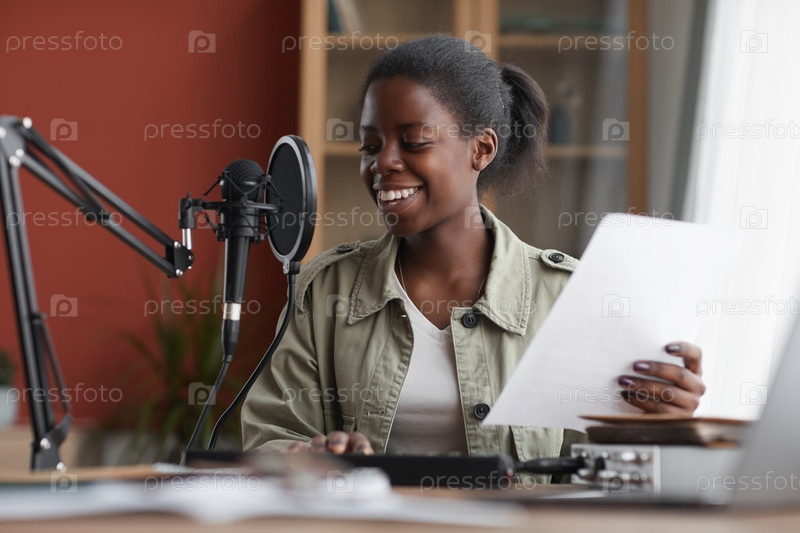 Улыбающаяся афроамериканская женщина записывает песню в студии