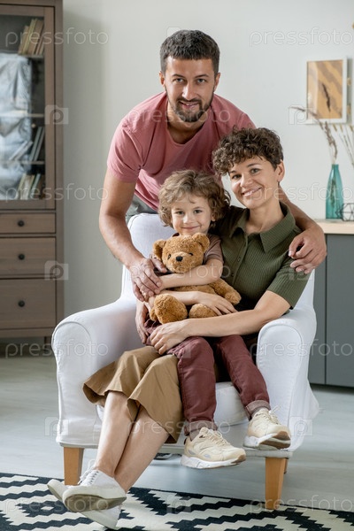 Молодой ласковый мужчина обнимает своего очаровательного маленького сына и красивую жену