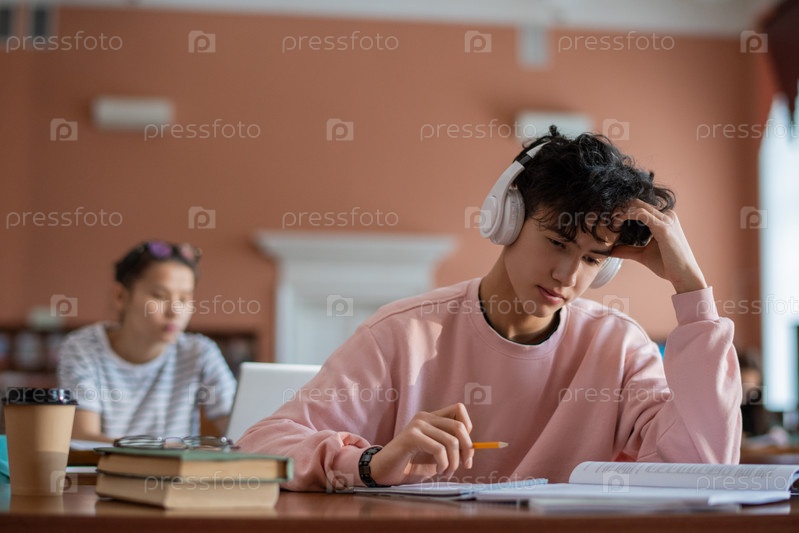 Вдумчивый ученик-подросток с наушниками, смотрящий на страницу руководства