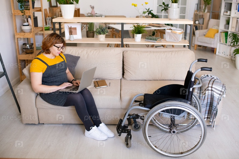 Современный инвалид студент с ноутбуком ищет онлайн-курс на диване