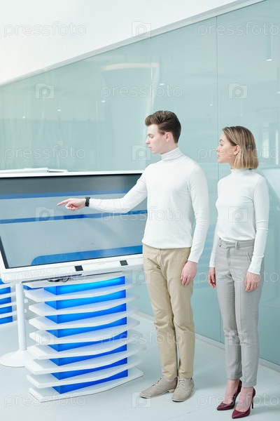 Два молодых элегантных коллеги обсуждают виртуальную информацию на дисплее