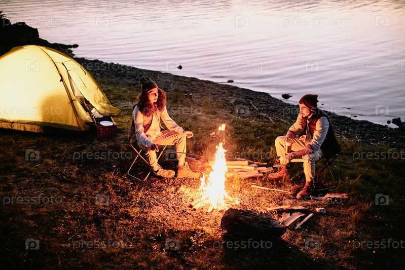 Молодая романтическая пара сидит у костра на берегу реки, разговаривает и жарит колбасы