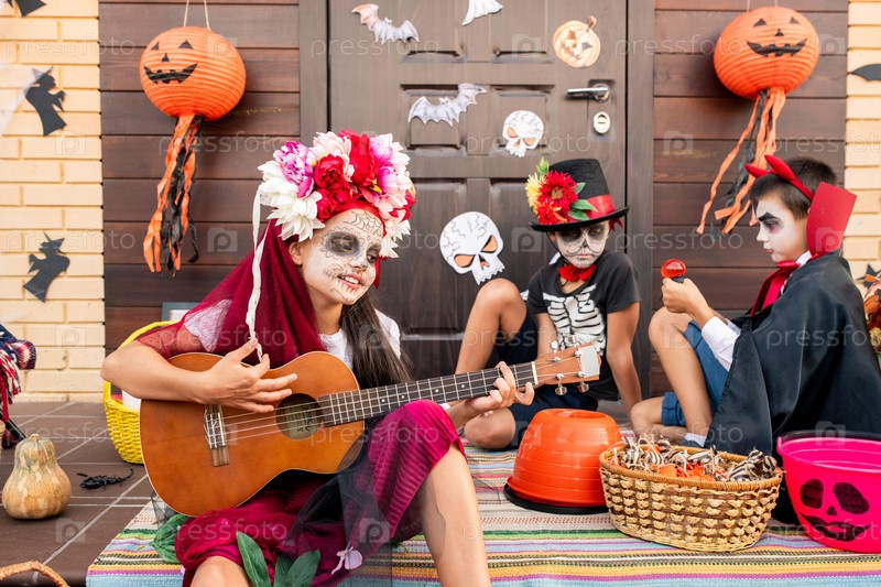 Милая девушка в костюме Хэллоуина сидит на лестнице, поёт и играет на гитаре