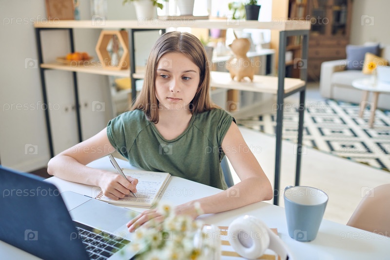 Серьезная девушка смотрит на дисплей ноутбука, участвуя в онлайн-дискуссии