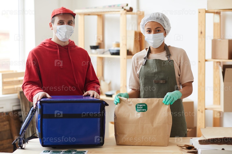 Работники, носящие маски при доставке продуктов питания