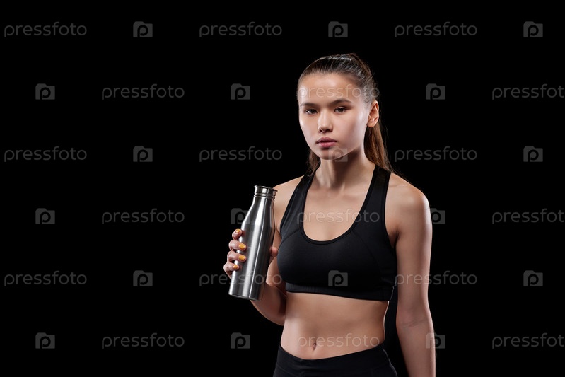 Молодая спортсменка с металлической бутылкой питьевой воды после тренировки