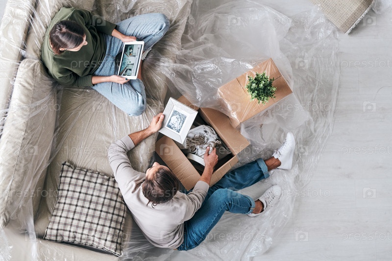 Молодая женщина с сенсорным панелем сидит на диване, пока ее муж распаковывает коробку