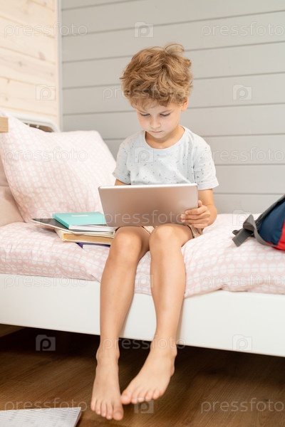 Маленький школьник с цифровым планшетом сидит на кровати и смотрит онлайн видео