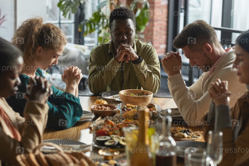 Разнообразная группа людей, молящихся за ужином