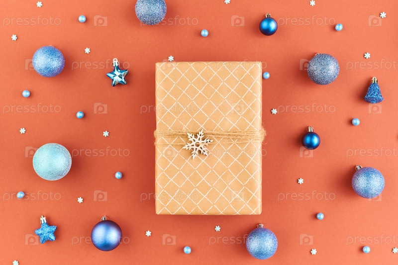 Плоская компоновка коробки с рождественским подарком, окруженной группой серебряных украшений