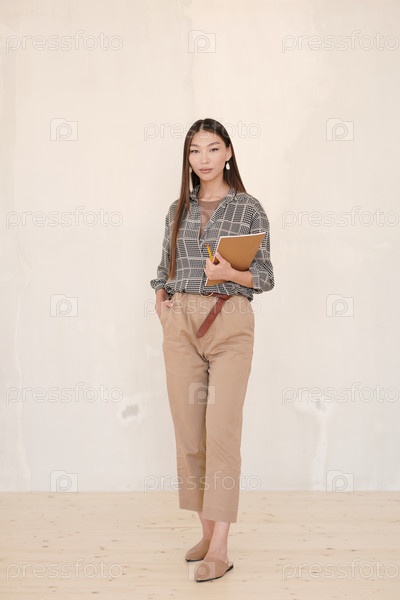 Молодая деловая женщина с длинными темными волосами, держащая блокнот и карандаш