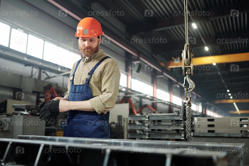 Бородатый инженер в рабочей одежде и жесткая шляпа, стоящая рядом с огромными железными деталями