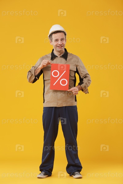 Улыбающийся зрелый рабочий, держащий знак продажи