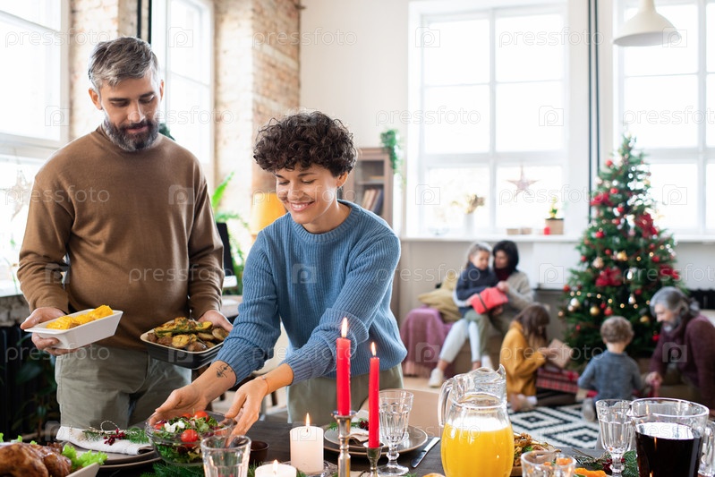 Счастливый муж и жена ставят домашний салат, запеченные картофель на стол