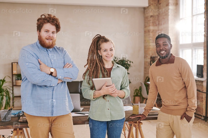 Портрет улыбающихся молодых межрасовых коллег, стоящих за столом и работающих в офисе на чердаке