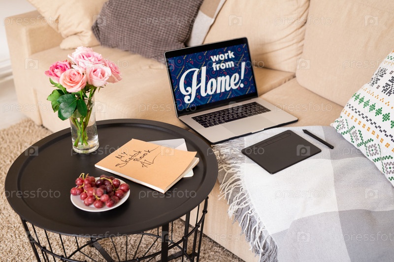 Небольшой круглый стол с букетом роз, свежими красными виноградами на тарелке и книгой эскизов