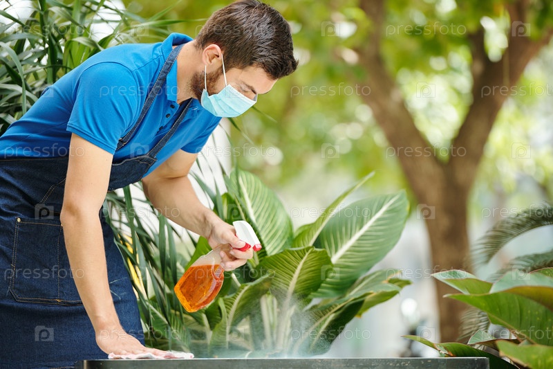 Работник кофейни, убирающий столы