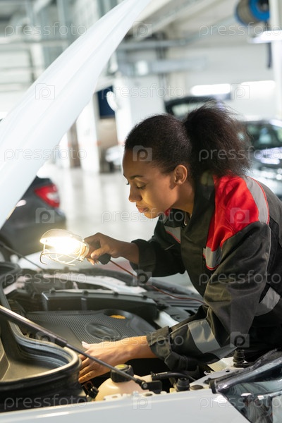 Молодая женщина-техник смешанной расы с лампой, согнутой над открытым капотом автомобиля