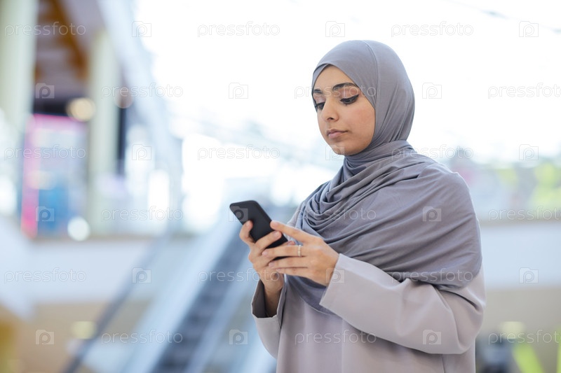 Ближневосточная женщина использует смартфон в современном городе