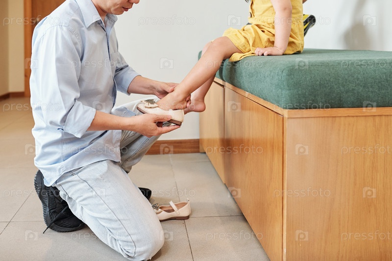 Помогает дочери надеть обувь