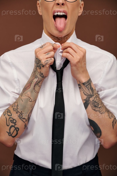 Ухмыляющаяся элегантная деловая женщина среднего возраста в белой рубашке, показывающая язык