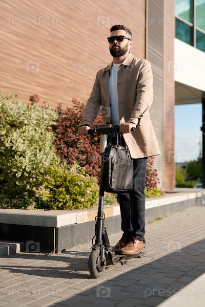 Бородатый бизнесмен в элегантной повседневной одежде переезжает на работу на электрическом скутере