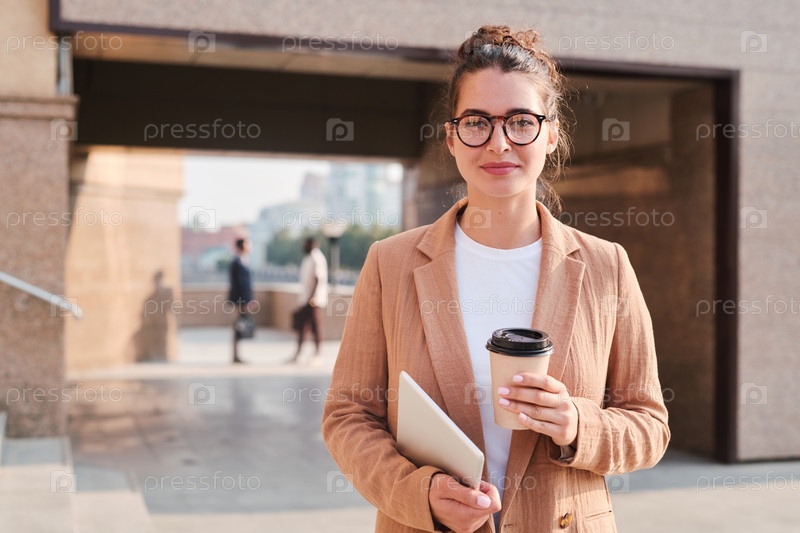 Молодая брюнетка-бизнесменка в очках и формальной одежде, выпившая стакан кофе