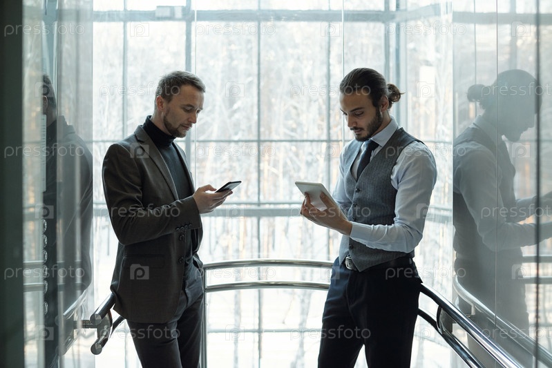 Два хорошо одетых молодых бизнесмена используют мобильные гаджеты во время перерыва