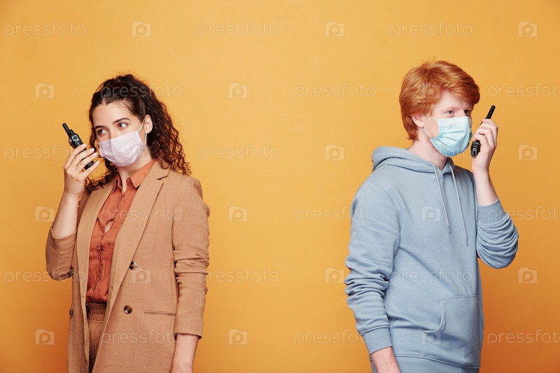Два молодых агента или охранника, использующих прослушивающие устройства во время стояния у стены