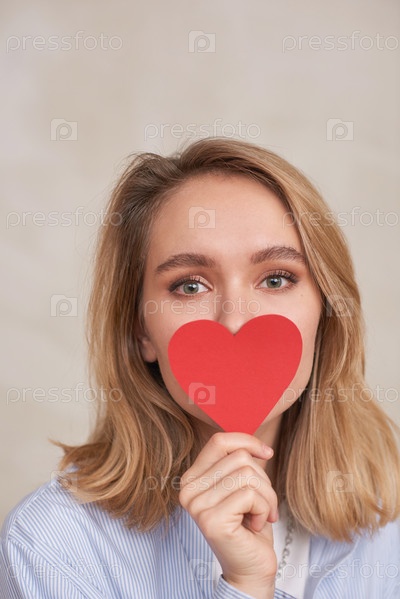 Близкий студийный портрет очаровательной молодой женщины, скрывающей нижнюю часть лица с бумажным сердцем и смотрящей на камеру