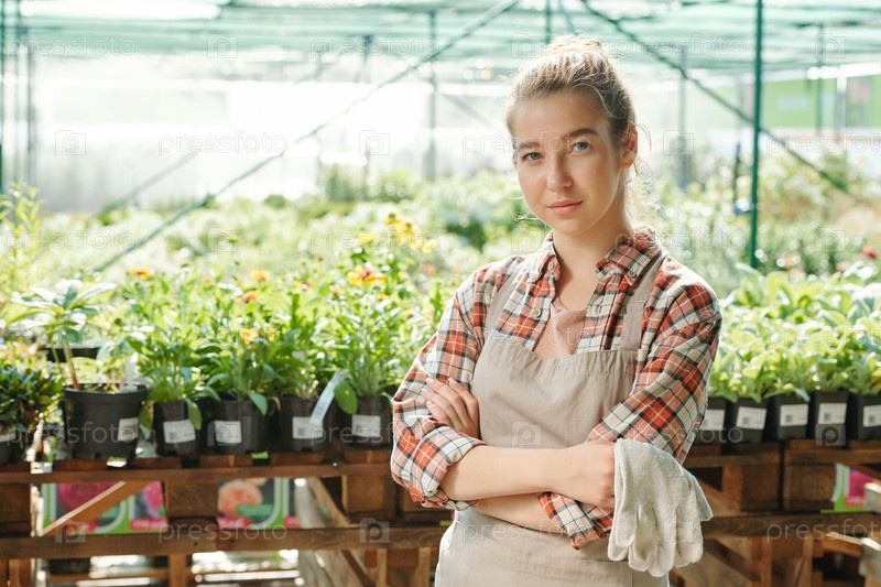 Молодая серьезная фермерка с перчатками в руках стоит перед камерой