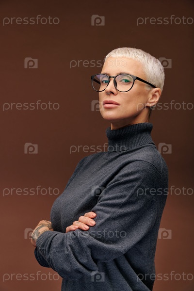 Стильная женщина в сером пуловере и очках, держа руки скрещенными к груди