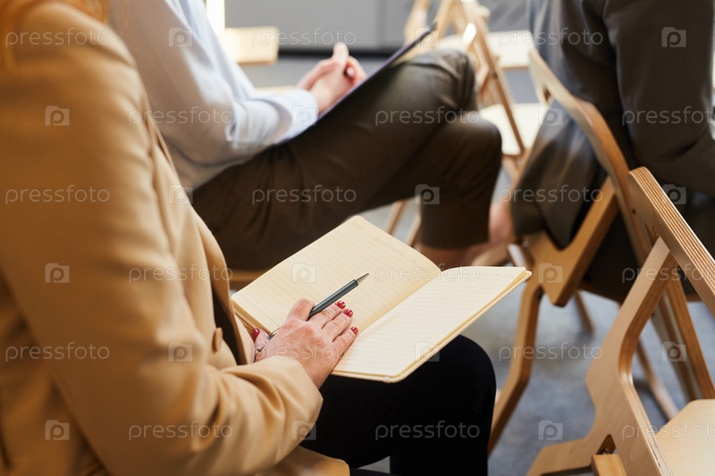Деловая женщина делает заметки в аудитории