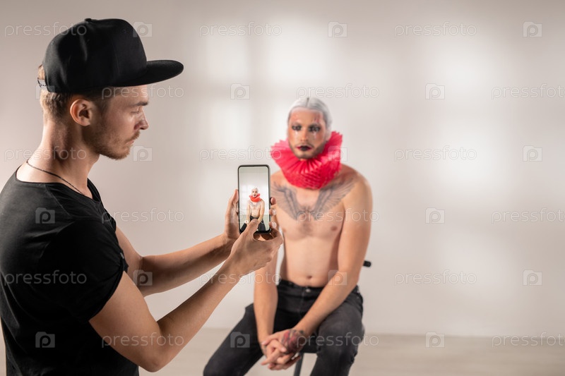 Молодой человек в черной футболке и шляпе фотографирует актера с макияжем