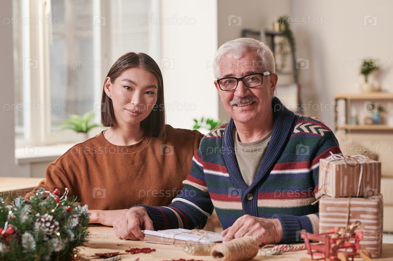 Портрет счастливого старшего человека и его внучки, сидящих за столом и упаковывающих рождественские подарки вместе дома