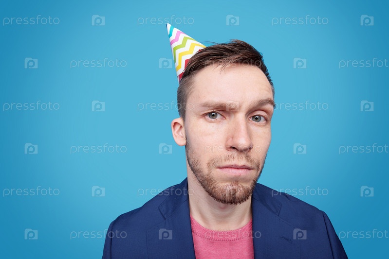 Подозрительный мужчина в синей куртке, розовом пуловере и шапке на день рождения смотрит на тебя