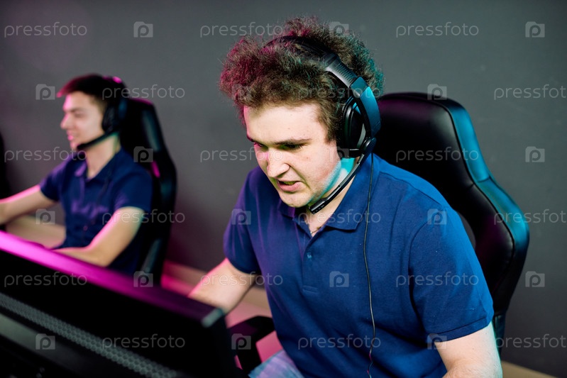 Молодой оператор колл-центра электронного спорта в гарнитуре комментирует сетевую игру