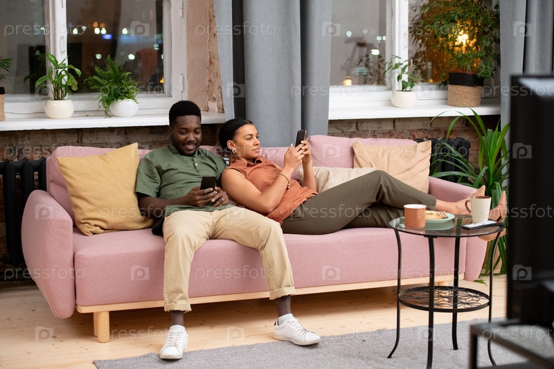 Подросток африканской этнической принадлежности и его девушка смешанной расы используют смартфоны