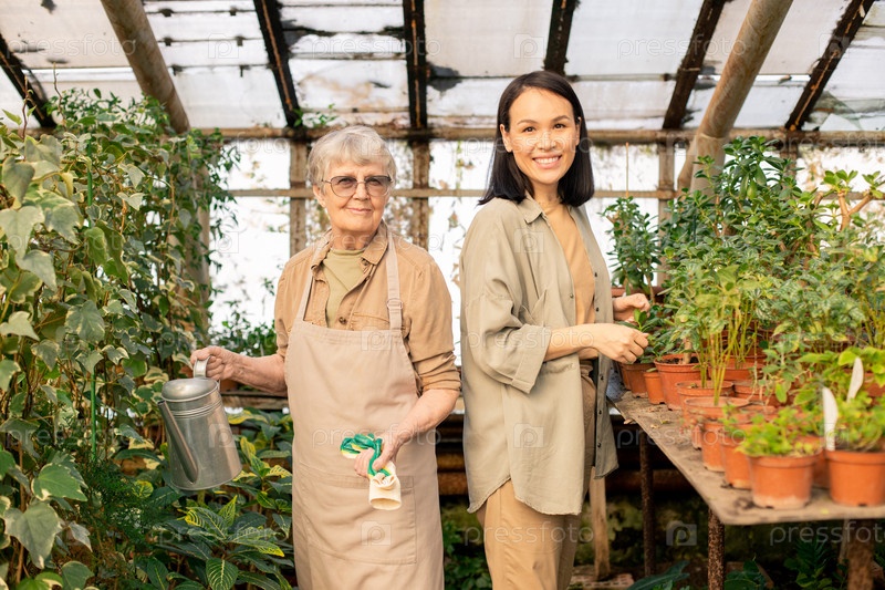 Пожилые и молодые женщины в теплице