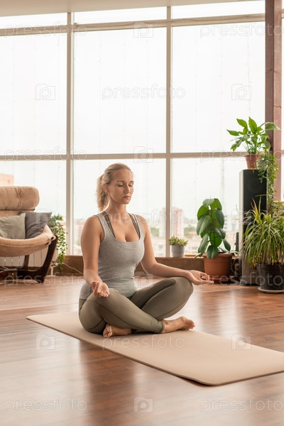 Молодая спокойная спортсменка пересекая ноги, сидя на коврике в позе лотоса