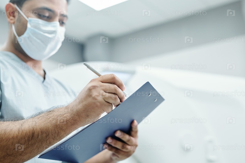 Руки зрелого врача-мужчины смешанной расы в форме и маске, делающего заметки