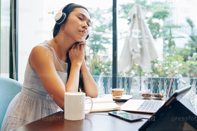 Деловая женщина слушает расслабляющую музыку