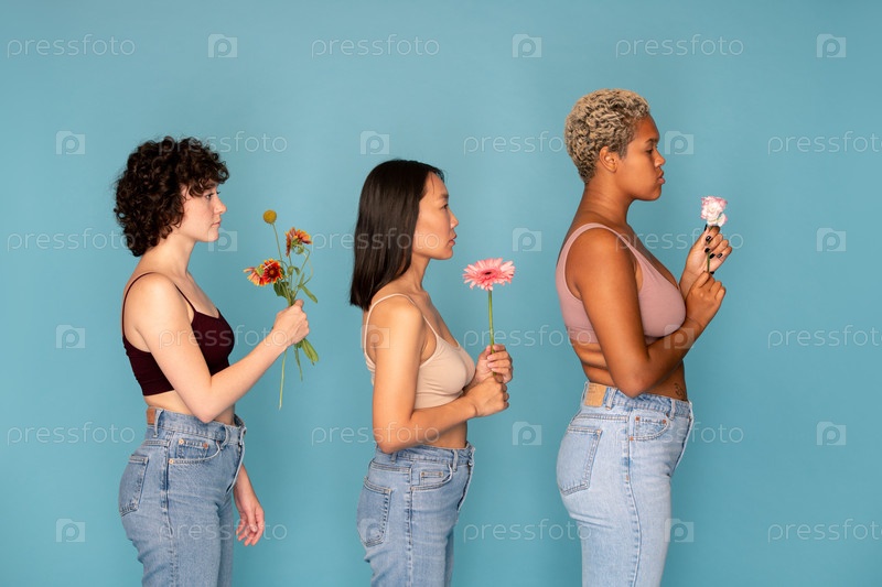 Боковой вид трех молодых женщин в танкерах и синих джинсах, держащих свежие цветы
