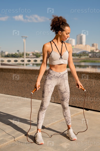 Молодая стройная спортсменка в активной одежде тренируется с скакалкой на берегу реки